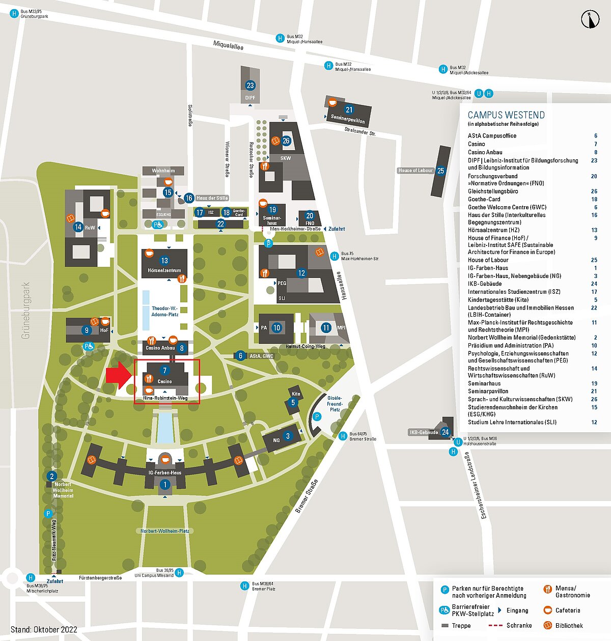 The university offers multiple bus stations "Uni Campus Westend", "Bremer Straße", and "Max-Horkheimer-Straße". The relevant subway station is called "Holzhausenstraße". You will find all public transportation stations around the Goethe Campus in light blue circles on the venue map above.